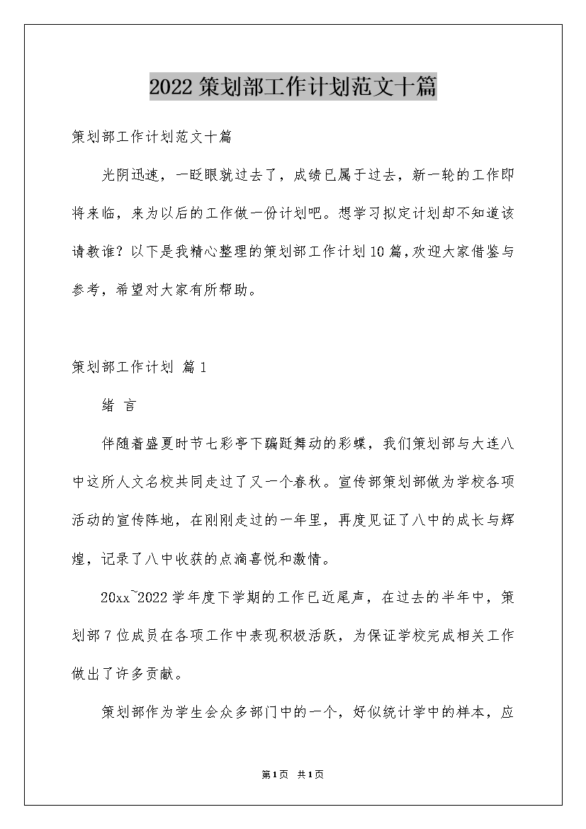 2022策划部工作计划范文十篇