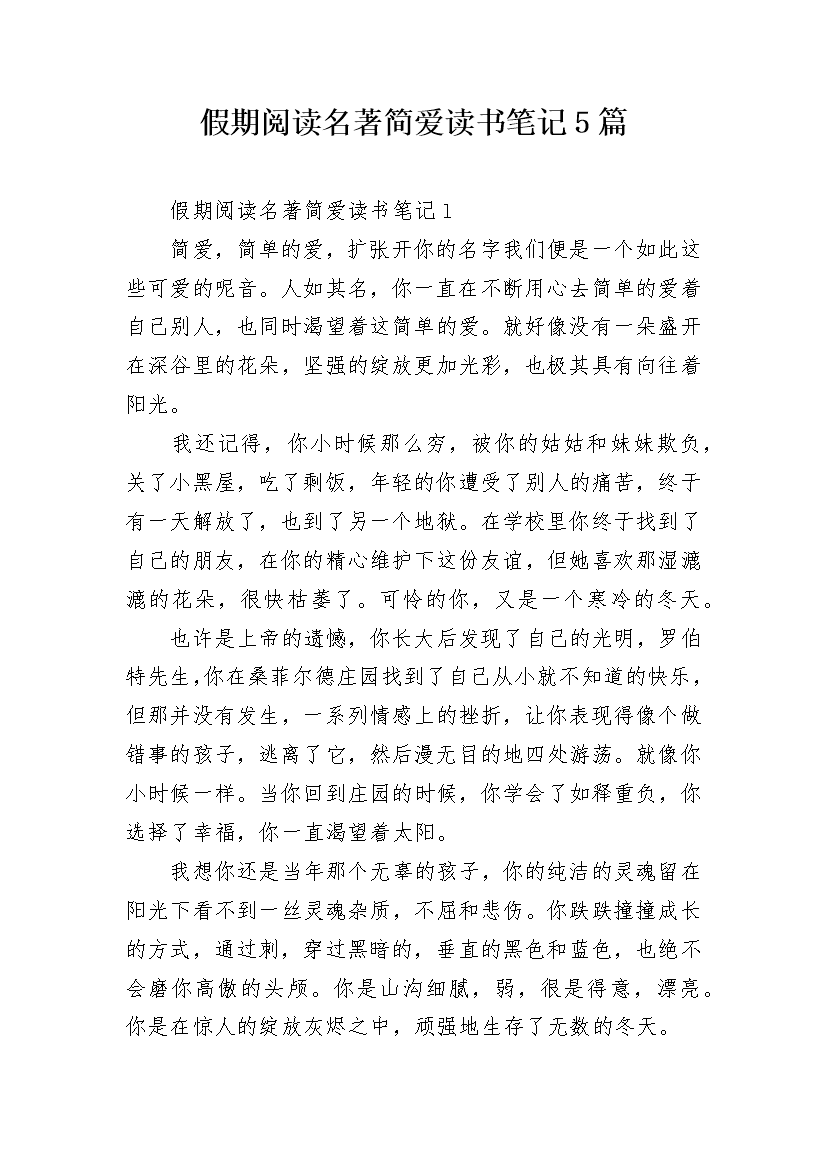假期阅读名著简爱读书笔记5篇