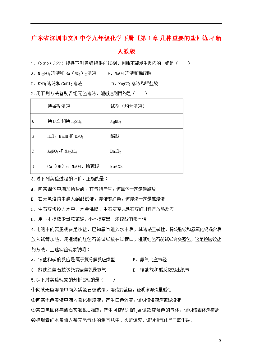 试题-广东-2013_广东省深圳市文汇中学九年级化学下册《第1章 几种重要的盐》练习(无答案) 新人教版