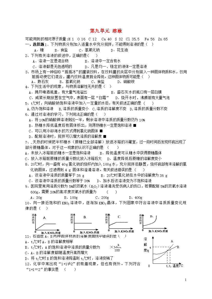 试题-全国-2015_九年级化学下册 第九单元 溶液单元综合测试(无答案) 新人教版