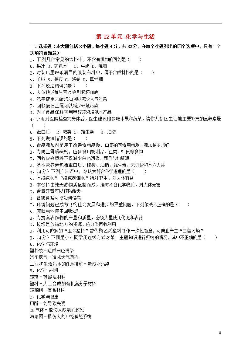 试题-江西-2016_江西省赣州市宁都县固厚中学2016年九年级化学下册《第12单元 化学与生活》单元综合测试题(含解析) 新人教版