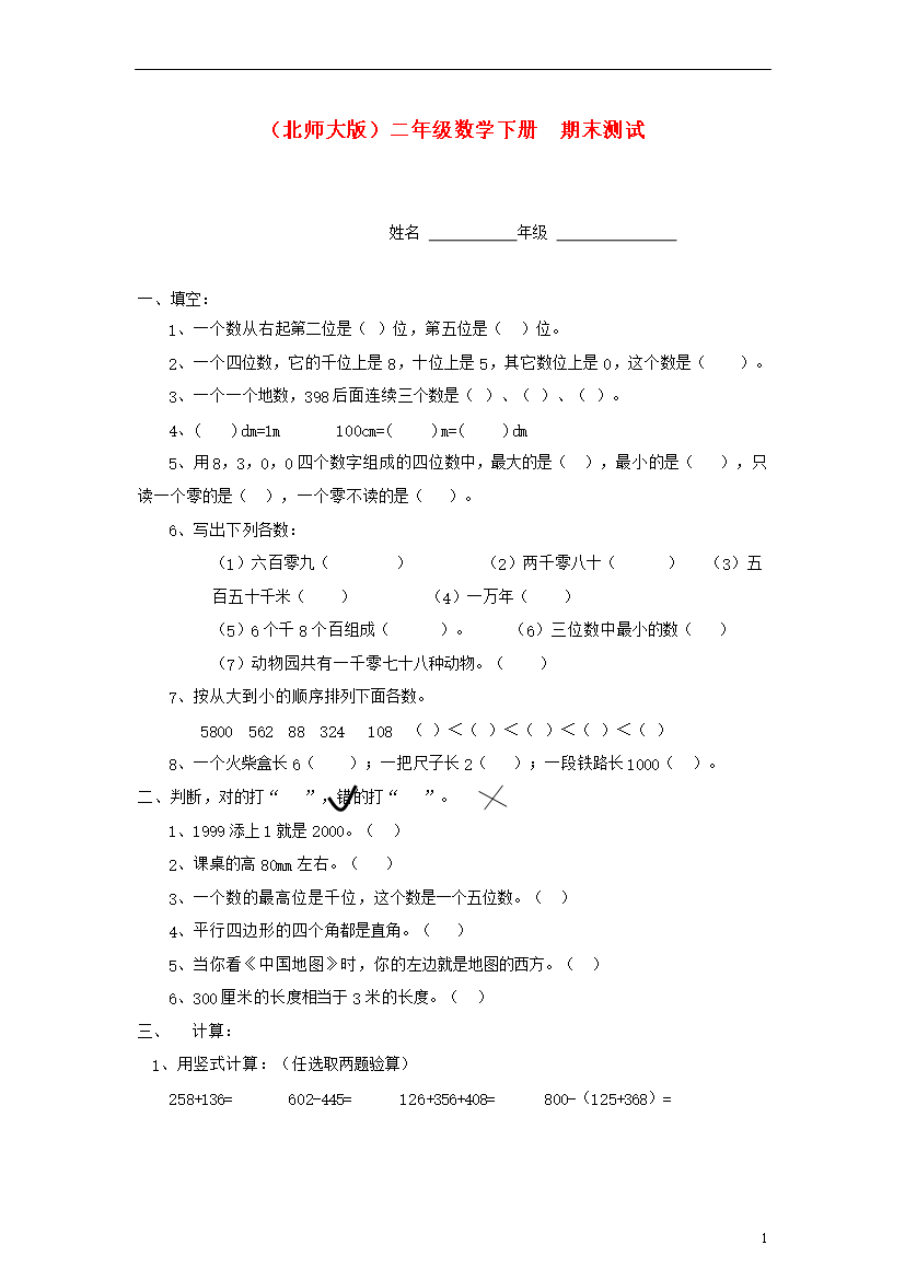 试题-全国-2013_二年级数学下册 期末测试(无答案)北师大版