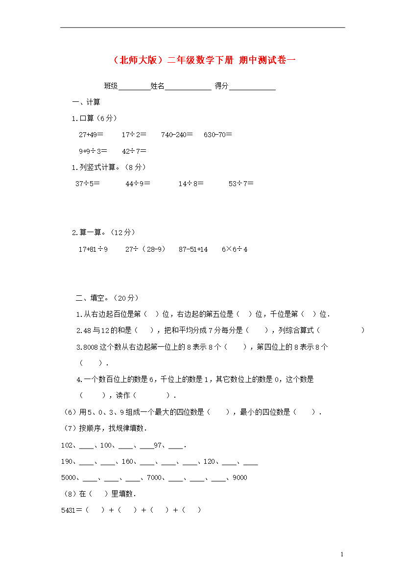 试题-全国-2013_二年级数学下册 期中测试卷(无答案)(打包6套)北师大版