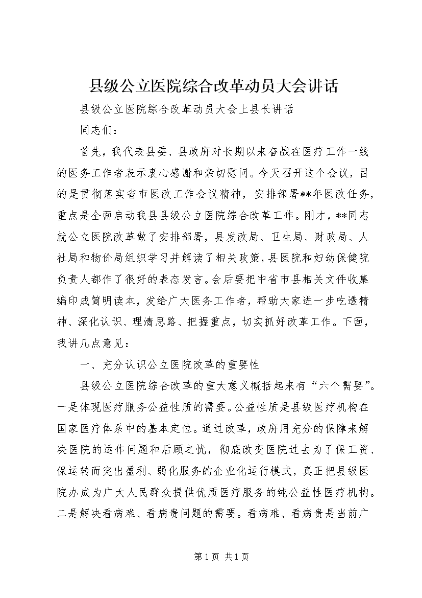 县级公立医院综合改革动员大会讲话 (2)