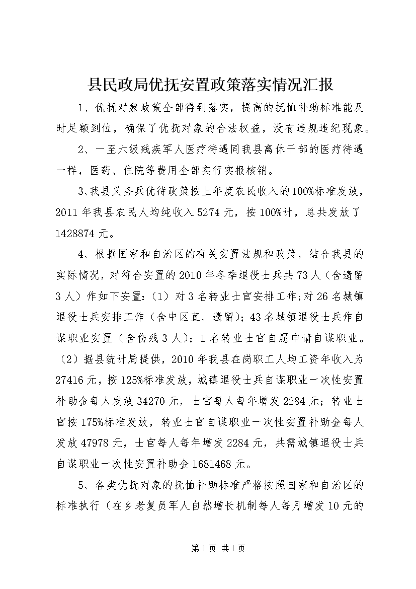 县民政局优抚安置政策落实情况汇报