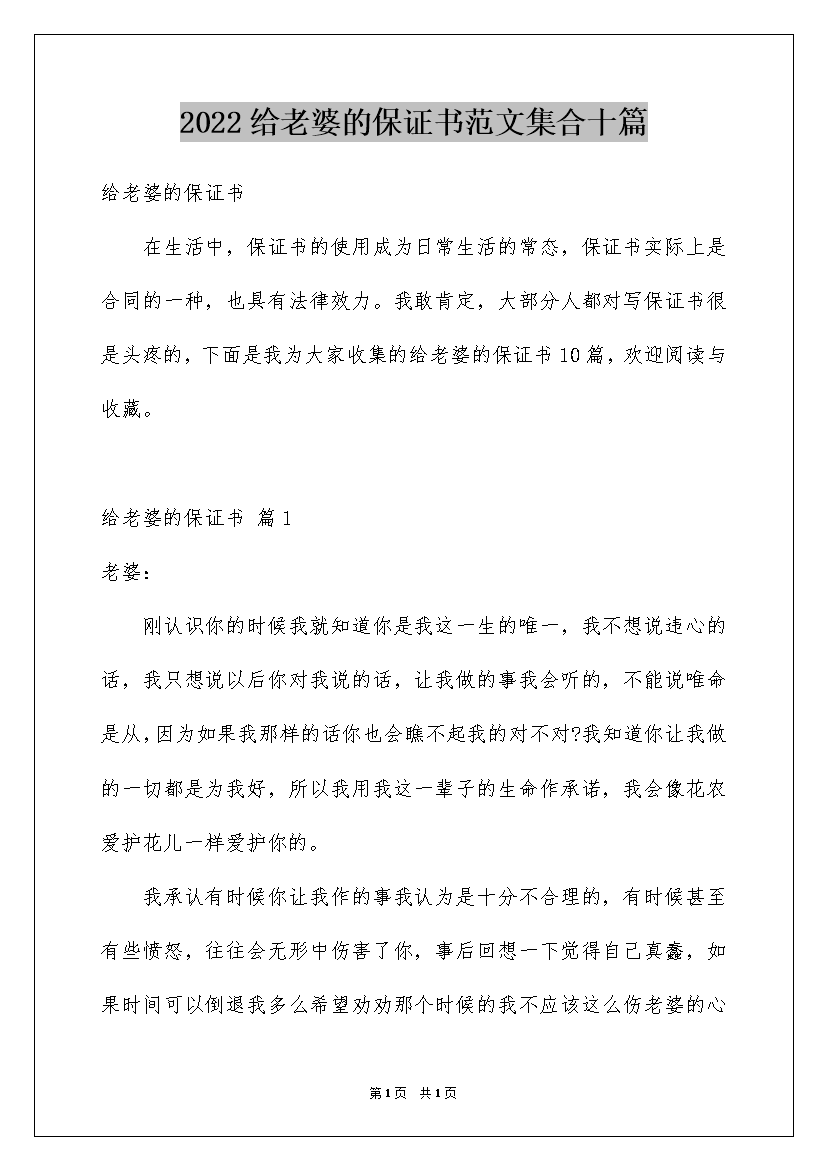 2022给老婆的保证书范文集合十篇