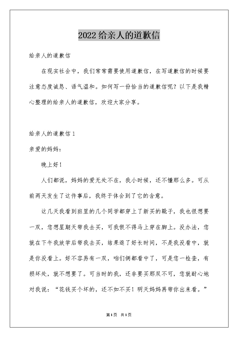 2022给亲人的道歉信