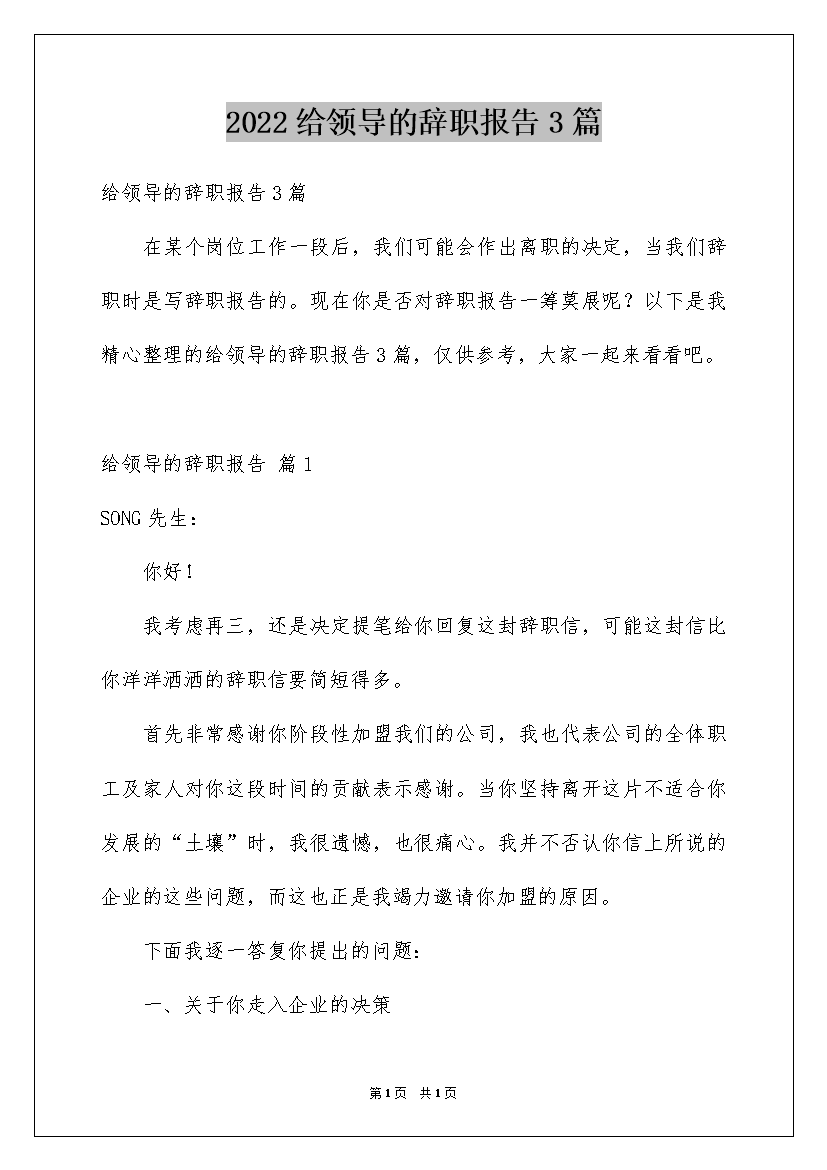 2022给领导的辞职报告3篇
