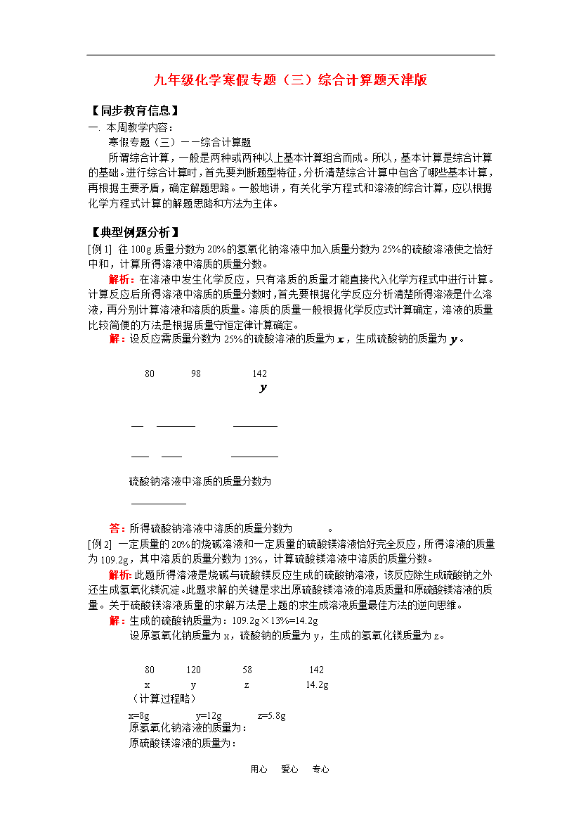 试题-全国-2009_九年级化学寒假专题(三)综合计算题天津版知识精讲