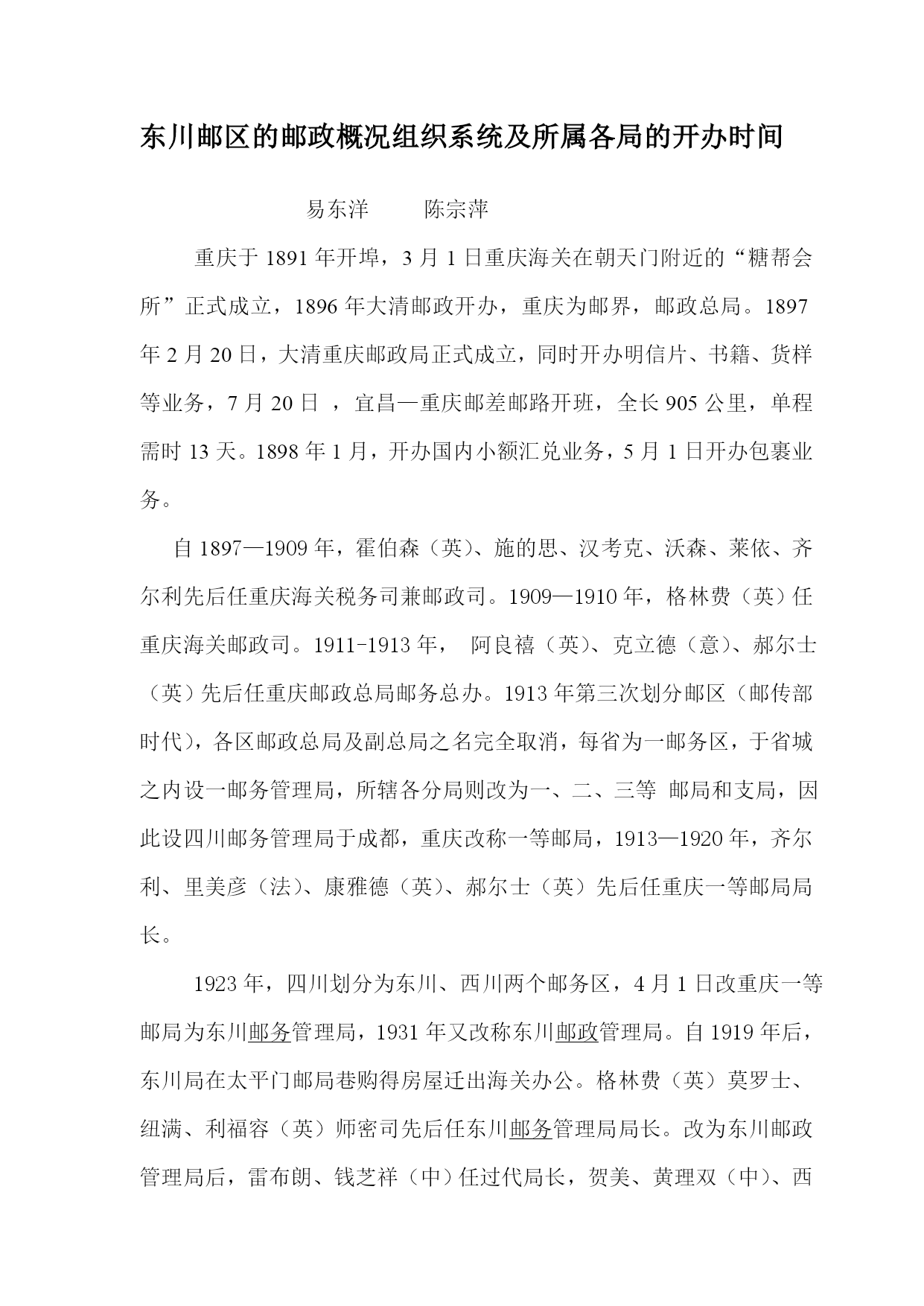 东川邮区的邮政概略组织系统及所属各局的开办时间