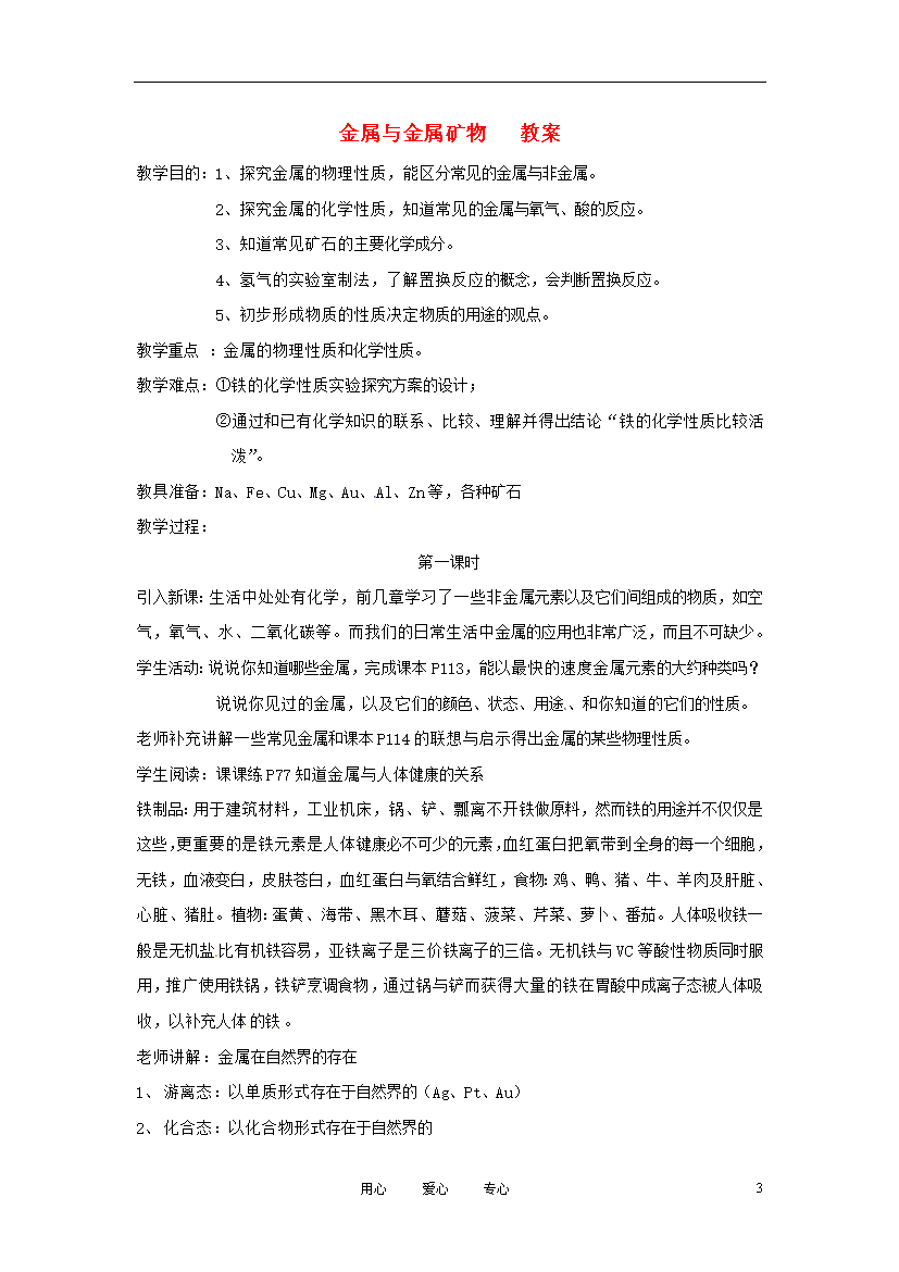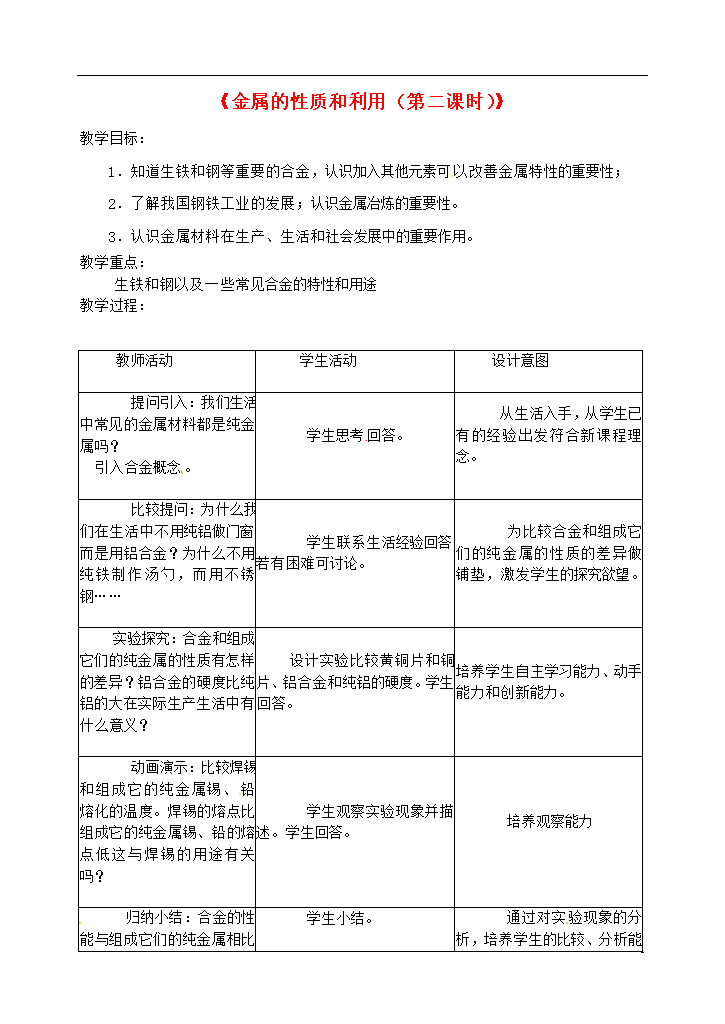 教案-江苏-2012_江苏省九年级化学 第五章 第一节 金属与金属矿物(第三课时)教案 沪教版