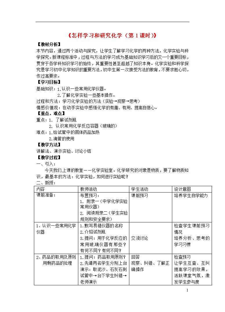 教案-江苏-2013_江苏省丹阳市前艾中学九年级化学全册《怎样学习和研究化学(第1课时)》教案 沪教版