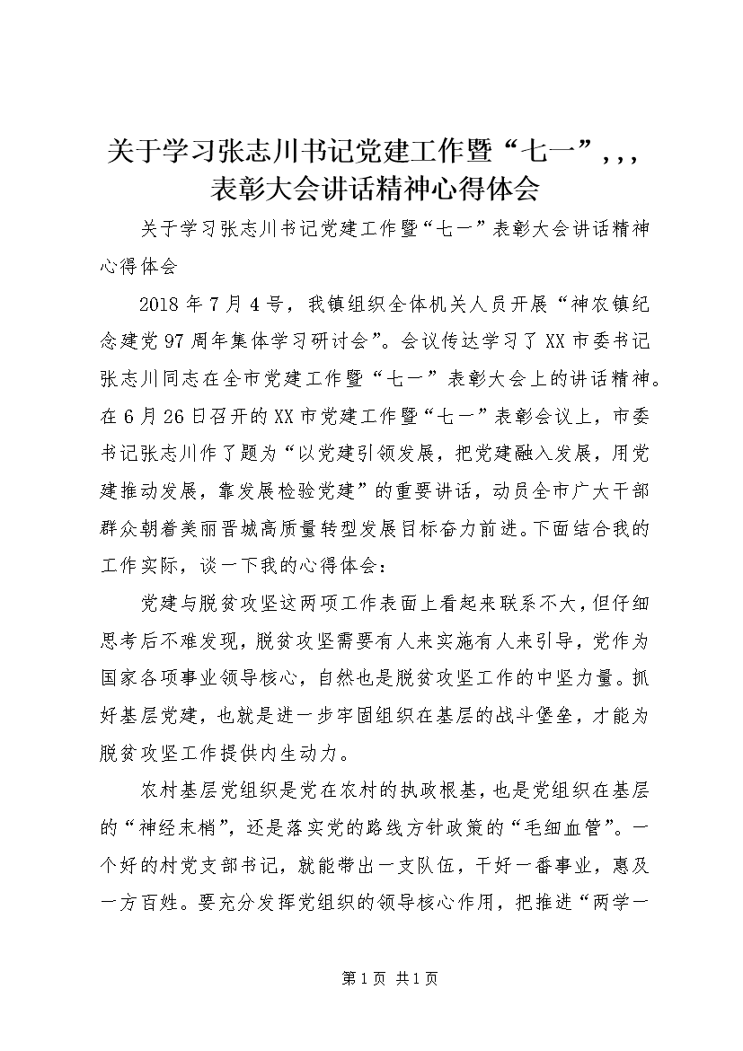 关于学习张志川书记党建工作暨“七一”,,,表彰大会讲话精神心得体会