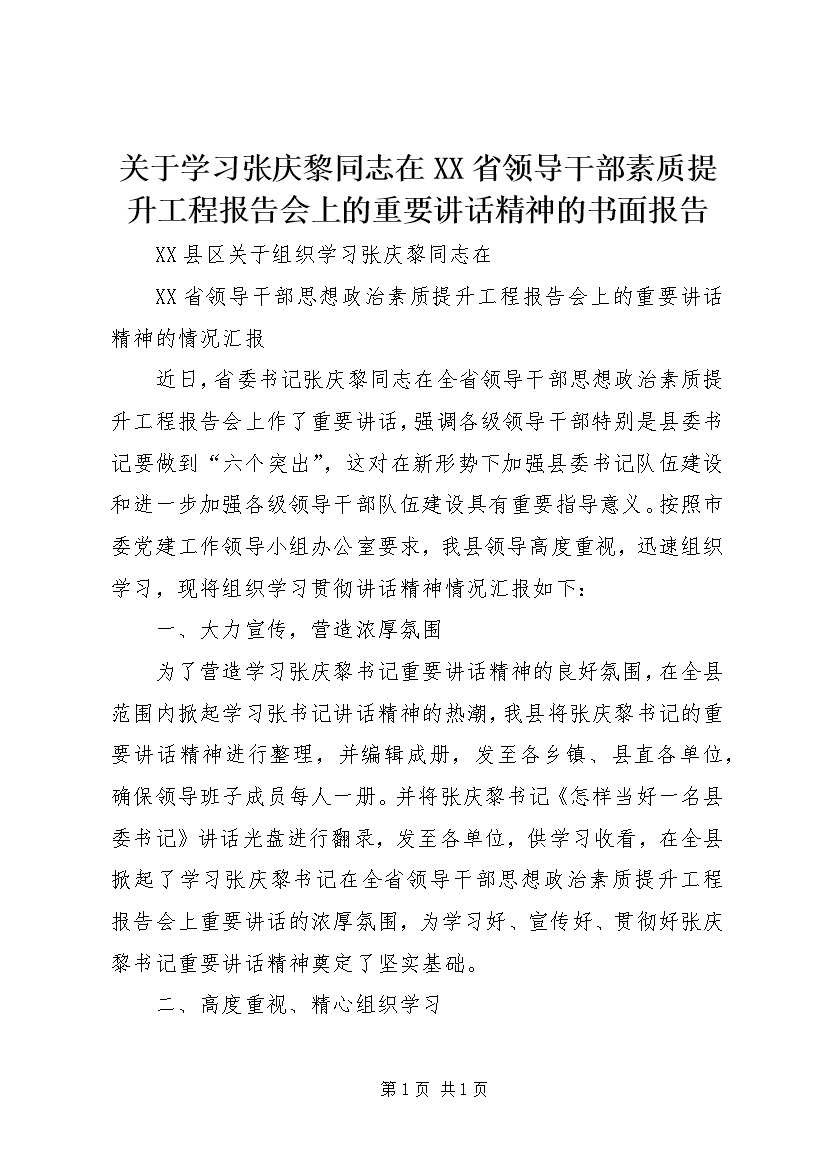 关于学习张庆黎同志在XX省领导干部素质提升工程报告会上的重要讲话精神的书面报告 (2)