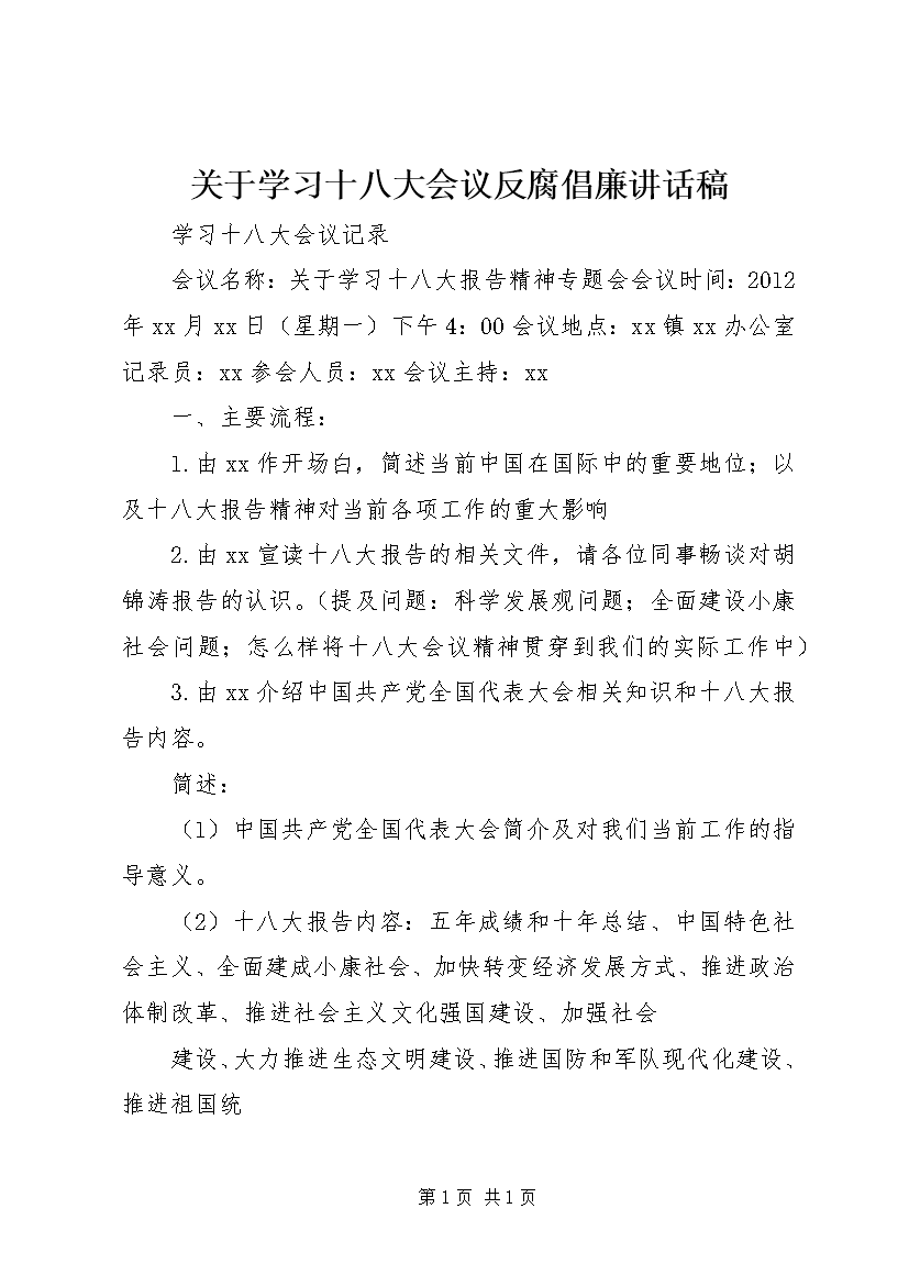 关于学习十八大会议反腐倡廉讲话稿 (3)