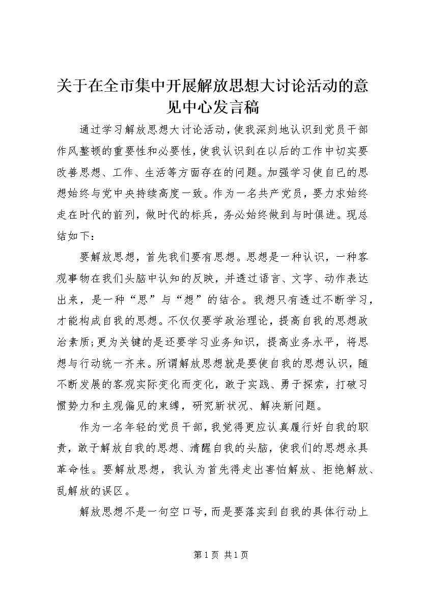 关于在全市集中开展解放思想大讨论活动的意见中心发言稿