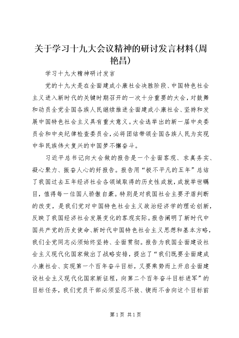 关于学习十九大会议精神的研讨发言材料(周艳昌) (2)